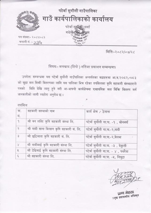 मलको मूल्य निर्धारण गरिएको र मलखाद (डिपो) नतिजा प्रकाशन सम्बन्धमा