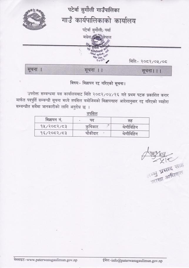 विज्ञापन रद्द गरिएको सूचना