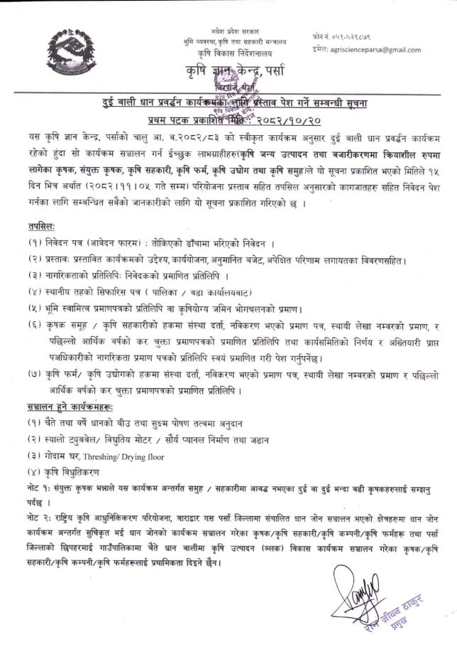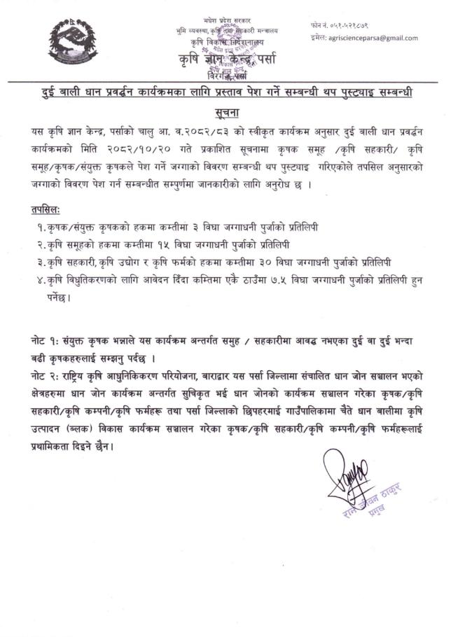 दुई बाली धान प्रवर्द्धन कार्यक्रमका लागि प्रस्ताव पेश गर्ने सम्बन्धी थप पुस्ट्याइ सम्बन्धी सूचनाा