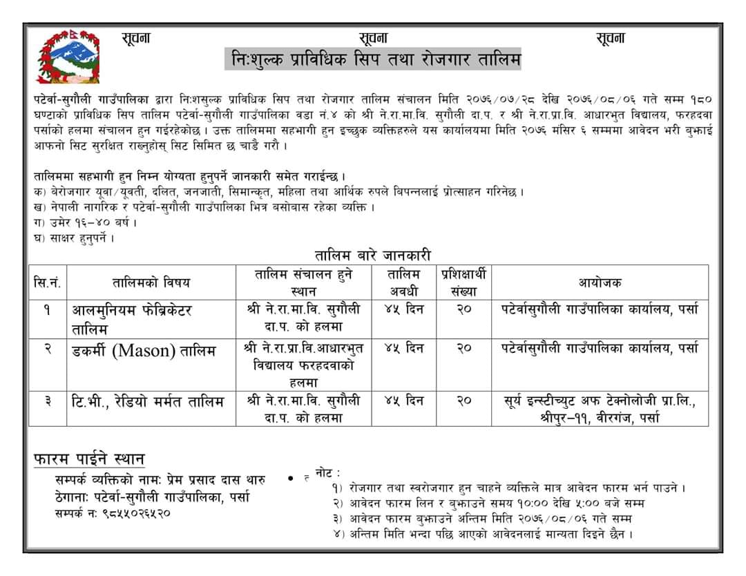 निःशुल्क प्राविधिक तालिमको सुचना