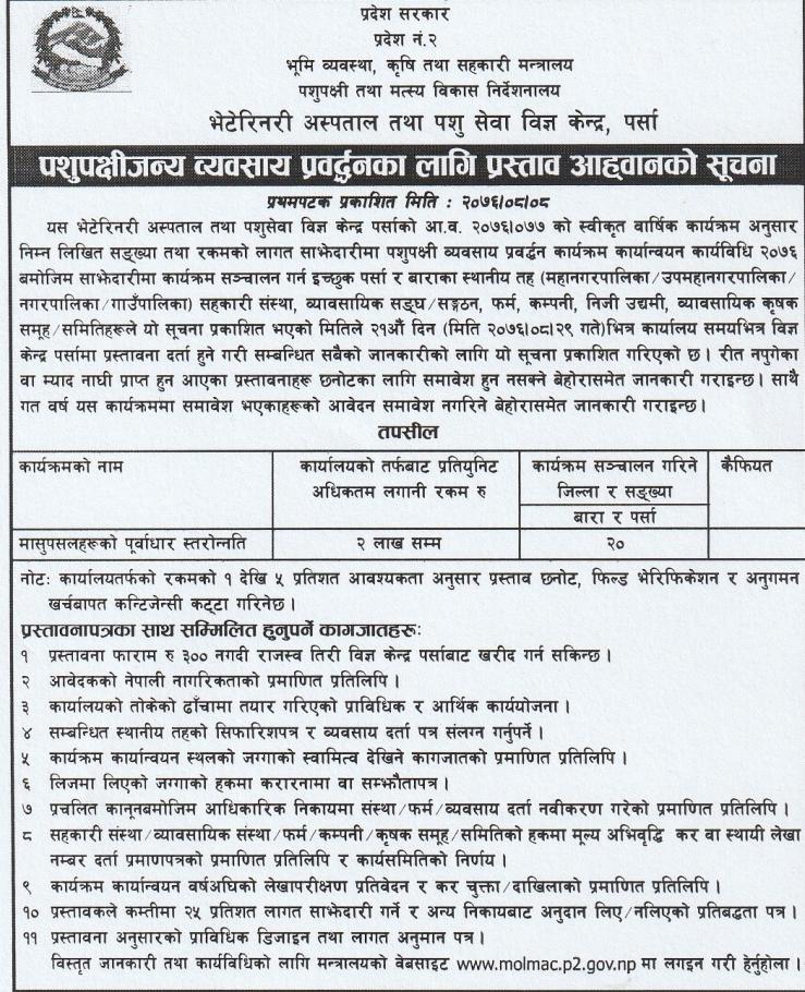 पशुपक्षीजन्य व्यवसाय प्रवर्द्धनका लागि प्रस्ताव आह्ववानको सूचना