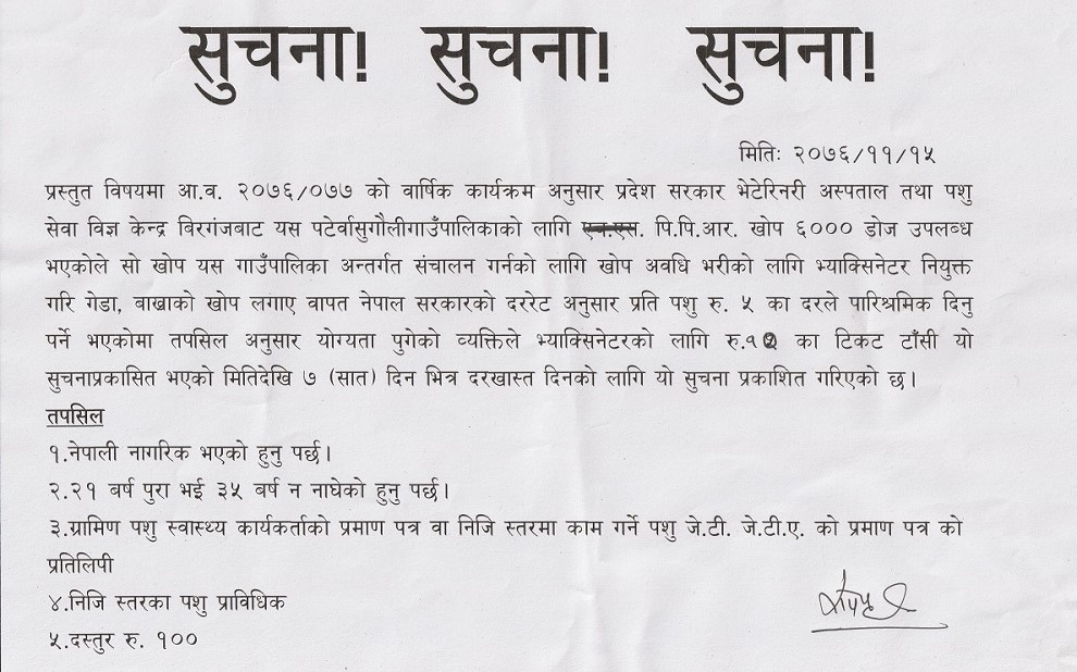 पि.पि.आर खोप र एच.एस.प्लसबी.क्यू खोप - लगाउनको लागि भ्याक्सिनेटर आवश्यक्ताको सुचना