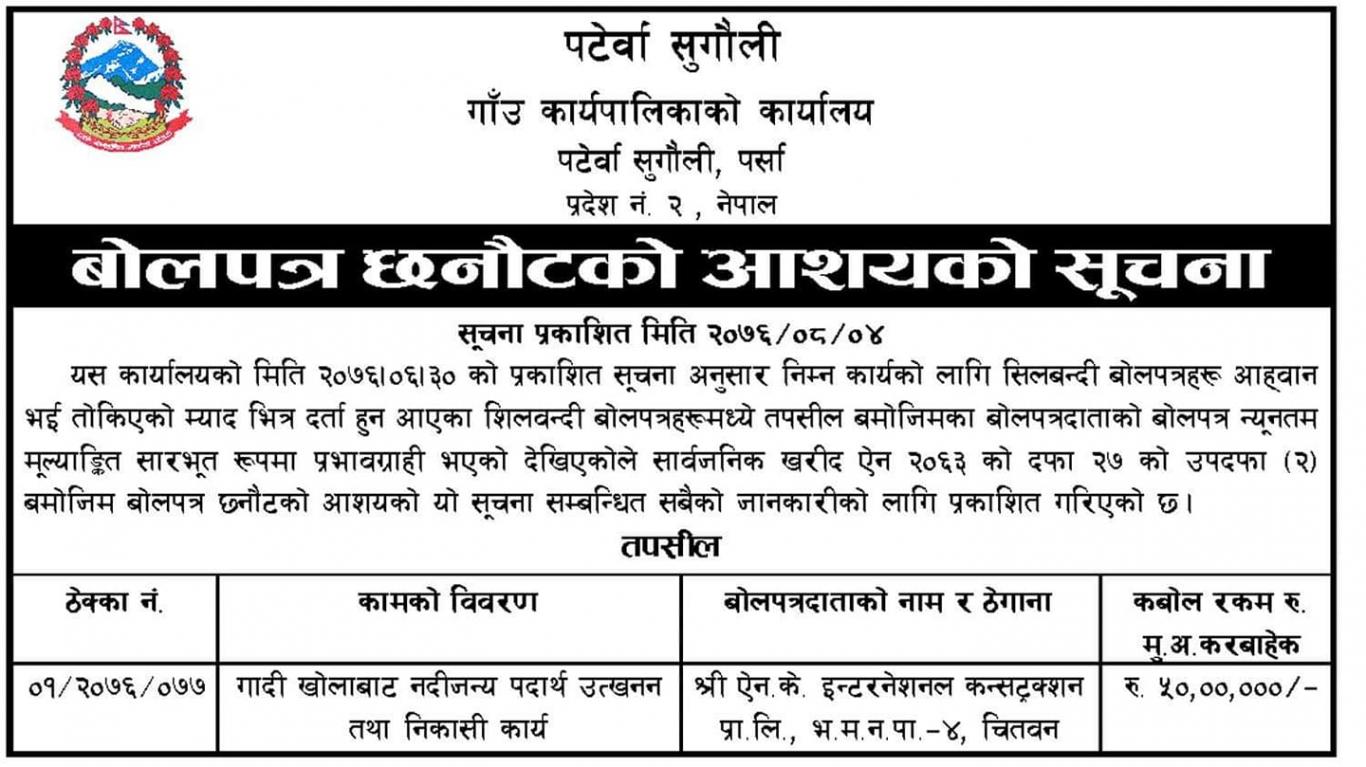 नदीजन्य पदार्थको उत्खनन् तथा विक्रीको लागि बोलपत्र आव्हान सम्बन्धी सूचना