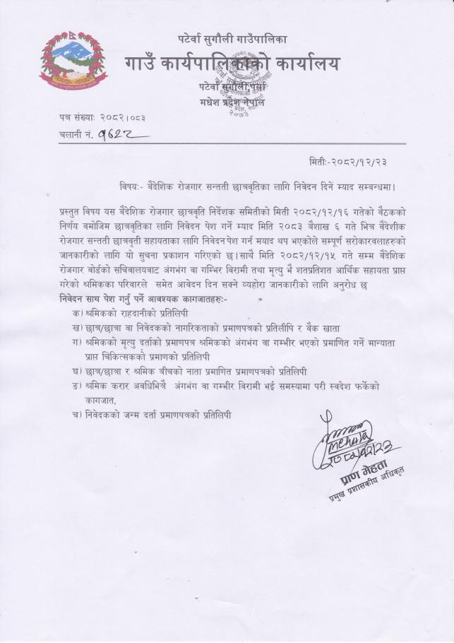 वैदेशिक रोजगार सन्तती छात्रवृतिका लागि निवेदन दिने म्याद सम्बन्धमा