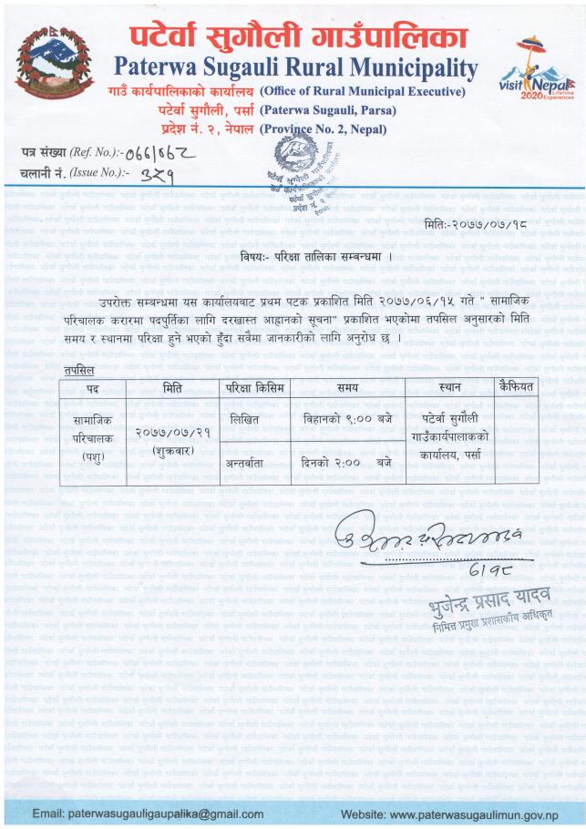 सामाजिक परिचालक (पशु) को परिक्षा तालिका सम्बन्धमा