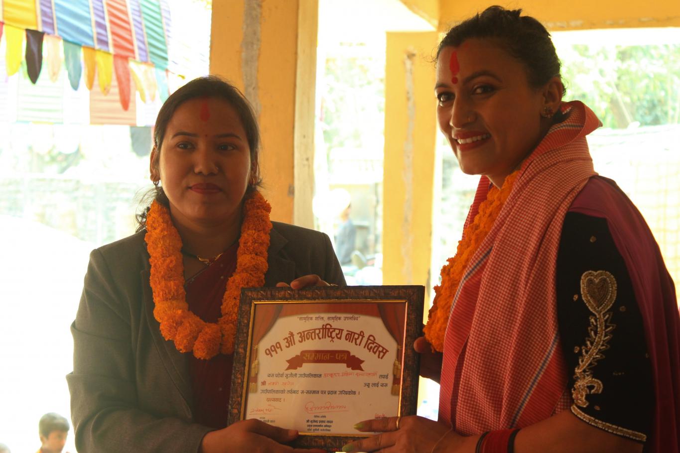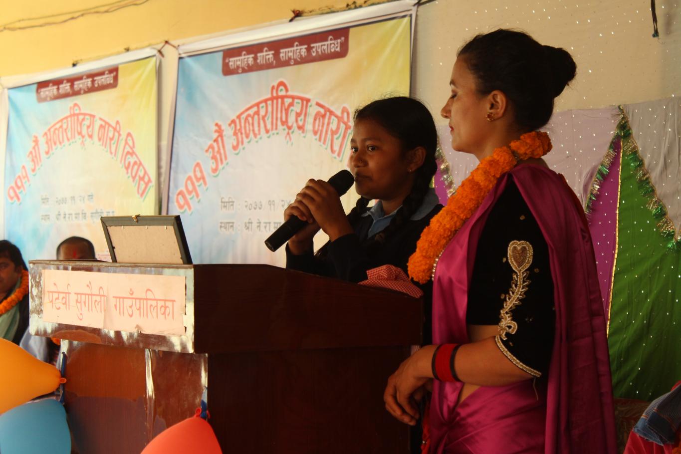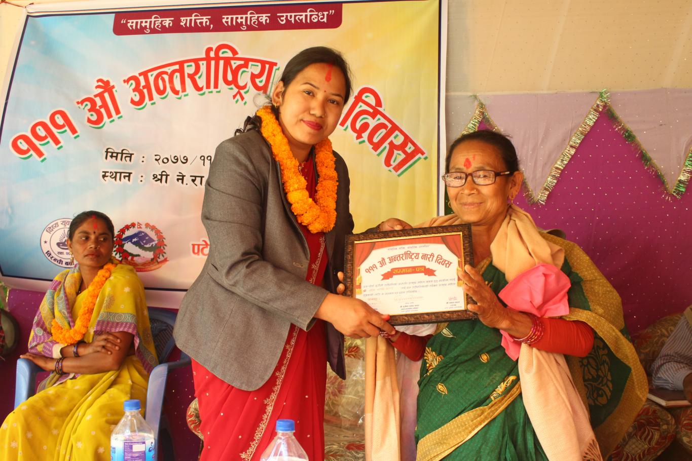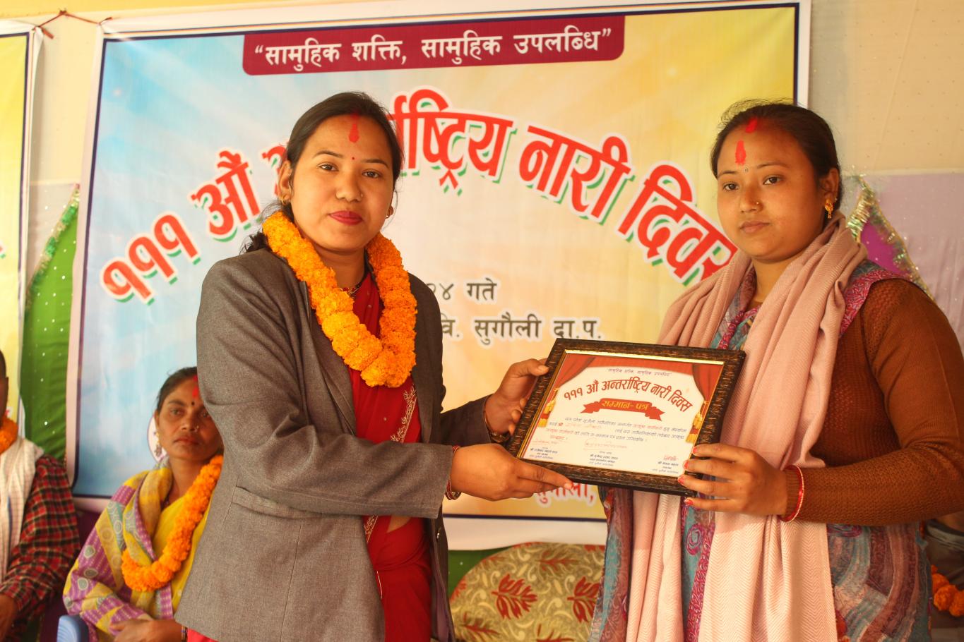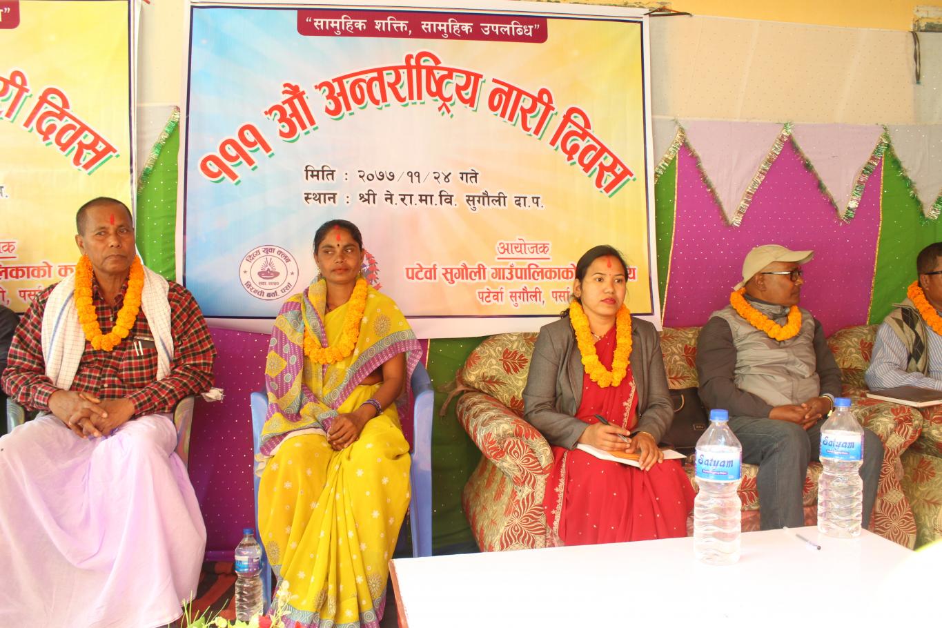 यस पटेर्वा सुगौली गाउँपालिका पर्सामा मिति २०७७ फालगुन २४ गते (2021 March 8) को दिन वडा नं. ४ स्थित श्री ने.रा.मा.वि सुगौली दा.पमा वडा अध्यक्ष श्री राजेश्वर महतो थारु ज्यूको अध्यक्षतामा १११ औं अन्तर्राष्ट्रिय नारी दिवस कार्यक्रम समपन्न भएको छ । उक्त कार्यक्रममा प्रमुख अतिथि गा.पा उपाध्यक्ष श्री ममता महतो ज्यू, विशिष्ट अतिथि प्र.प्र.अ श्री भुजेन्द्र प्रसाद यादव ज्यू, कार्यपालिका महिला सदस्य श्री प्रेमशिला देवी चमइन ज्यू, श्री मानमति देवी ज्यू, नयना देवी ज्यू, श्री कलही देवी ज्यू शिक्षा शाखा प्रमुख श्री शम्भु प्रसाद ज्यू, सू.प्र.अ. श्री सोलेन्द्र पंजियार ज्यू, सामाजिक विकास शाखा श्री राजकुमार प्र. महतो ज्यू, प्र.अ. श्री मोहन दास थारु ज्यू , DYC का अध्यक्ष श्री रामाकान्त कुर्मी ज्यू,सब-इन्जिनियर श्री रामबाबु राय ज्यू, वडा सचिव श्री जयनारायण महतो ज्यू, समाजप्रेमी श्री शिव थारु ज्यू, पत्रकार श्री ओम प्रकाश महतो ज्यू, गा.पा. कर्मचारी, महिला स्वास्थ्यकर्मी, स्वास्थ्य स्वयं सेवीका, विद्यालयका शिक्षक शिक्षिका, विद्यार्थीहरु , गाउँ/गाउँबाट आउनु भएका महिलाहरु आदि लगायतका उपस्थिति थियो । सो कार्यक्रमको उदघोषिका श्री लक्षमी खरेल ज्यू हुनुहुन्थ्यो र अतिथिहरुबाट अन्तर्राष्ट्रिय नारी दिवसको अवसर मा आ-आफ्नो मन्तवय प्रस्तुत गरी १/१ जना महिला उत्कृष्ट कर्मचारी ,स्वास्थ्यकर्मी, स्वयं सेवीका, शिक्षिका, SEE मा उत्कृष्ट अंक प्राप्त छात्रा, कृषि महिला समुह, सामाजिक परिचालक आदि लागि दोसाला , टिका लगाई प्रमाण पत्र सहित प्रोत्साहन गरी सो कार्यक्रम सम्पन्न गरियो ।