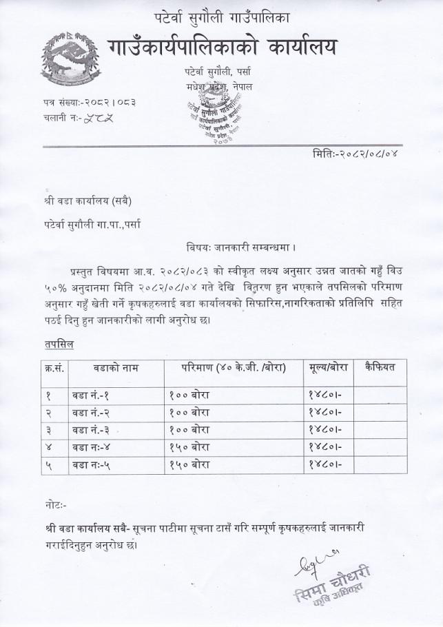 ५० प्रतिशत अनुदानमा गहुँ विउ वितरण सम्बन्धी सुचना- सबै वडा कार्यालय